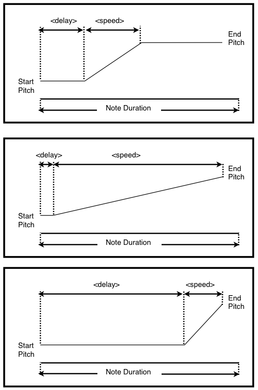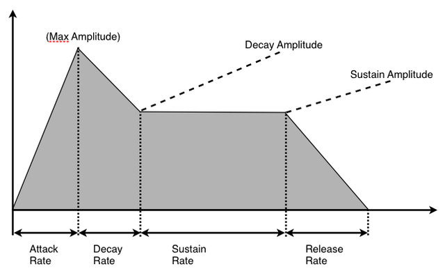 Note on <decay amplitude> and <sustain amplitude>: if these two parameters are equal, the amplitude will be held at that level during the sustain phase. Otherwise the amplitude will either increase or decrease (depending which is greater) over the course of the sustain phase. This allows you to have a (negative or positive) sloped sustain phase.
