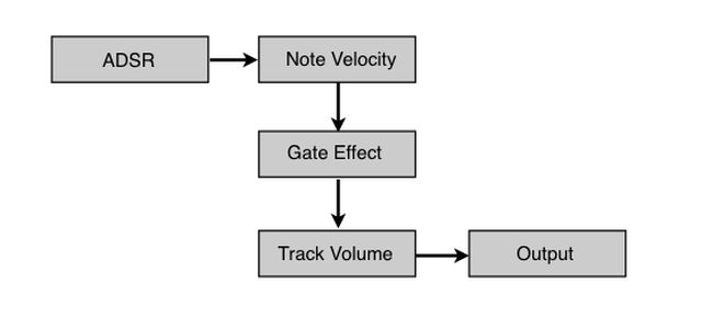 There are four stages in the output flow where the amplitude of the currently playing note is shaped or scaled. These are Note Velocity, ADSR, Gate Effect, Track Volume.