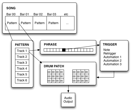 Songs contains Patterns. Patterns contain (six) Tracks. Each Track is assigned a Drum Patch and a Phrase. Phrases contains Triggers. Triggers use and control the parameters in the Drum Patch to create audio. Simple! The diagram above should help you understand the relationships more clearly. To save space only Track 1 is 'expanded'. In reality there would be a Phrase, Trigger and Drum Patch box for Tracks 2 to 6 also.