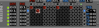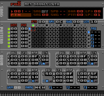 One of the fundamental features of PR8 is the fact that the Tracks are 'virtual'. What is meant by this is that the Tracks are not explicitly linked to one NES hardware voice. This means you can have a Drum on two or more Tracks that use the same Voice(s). Obviously, there is no 'magic' going on, what happens is that the Tracks 'steal' the use of the Voice when required. The priority for stealing is always this: the lower down the Pattern the Track is, the higher the priority. Let's set something up to illustrate what happens.