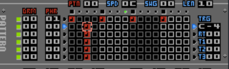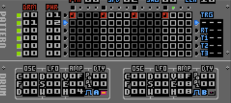 Then go to the Track Assignment for Track 2 (the second from the top) and set the Drum (DRM) to 01 and the Phrase (PHR) to 02. Move to the Drum Editor (you should now be editing Drum 01 - the number is shown in the bottom-left of the Drum Editor). Turn on Voice A by tapping SELECT and then set the AMP settings to 0F, 00 and 04 (top-to-bottom). Should look like this now: