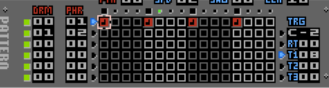 3) In order to make a noise we need to add a Trigger to the Grid. Hold B then tap UP. If the cursor goes to the Track Assignment (which it should because it remembers which of the Pattern 'windows' you were last in when moving to/from the Pattern area), tap RIGHT while still holding B. Put the cursor on the first step of Track 1 (top-left of the Grid) if it's not already there and then TAP A and a Trigger will be created where the cursor is: