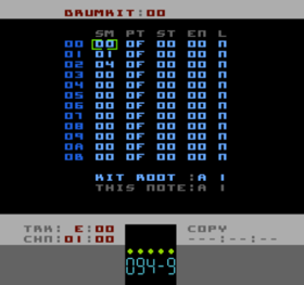 The other parameter you can set for a Drumkit is the Drumkit Root. This sets the Pattern note that will trigger the first Drum in the Drumkit. The first Drum is the one at the top of the table (00). The rest of the Drumkit is triggered by subsequent semi-tones above the Kit Root. This value is set per-Drumkit.