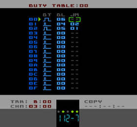 When a Duty Table is assigned to an Instrument, each time a new note is played the Duty Table starts at the first step and normally progresses to the end of the table (step 0F) at which point it loops back to the start and continues.