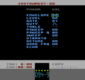specifies the ADSR Envelope number for the Instrument. Envelopes are defined and edited in the Envelope List page. Used on Tracks A, B & D only |