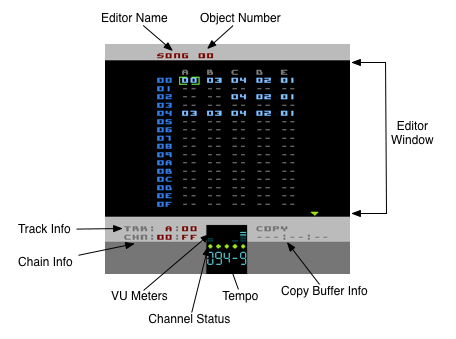 Where applicable, this number is the current Object you are editing. In this case 'SONG 00' shows you are editing Song 00. Some editor pages don't require an object number as the objects they relate to are presented in a list format and in those cases the object you are editing are represented by a whole row of the list.